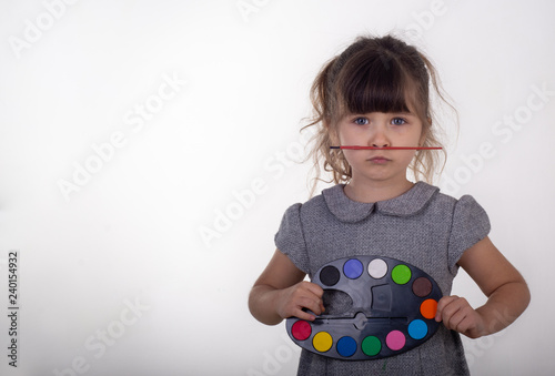 Funny 5 Years Old Child Holding Palette Of Paints For Drawing And