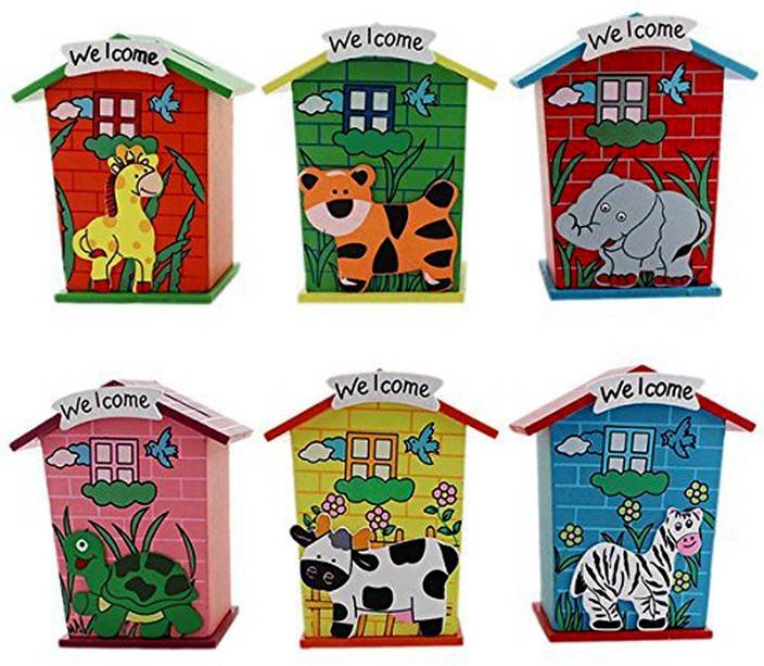 Art Bundle Money Safe Piggy Bank Wood House Animal Designs Multi