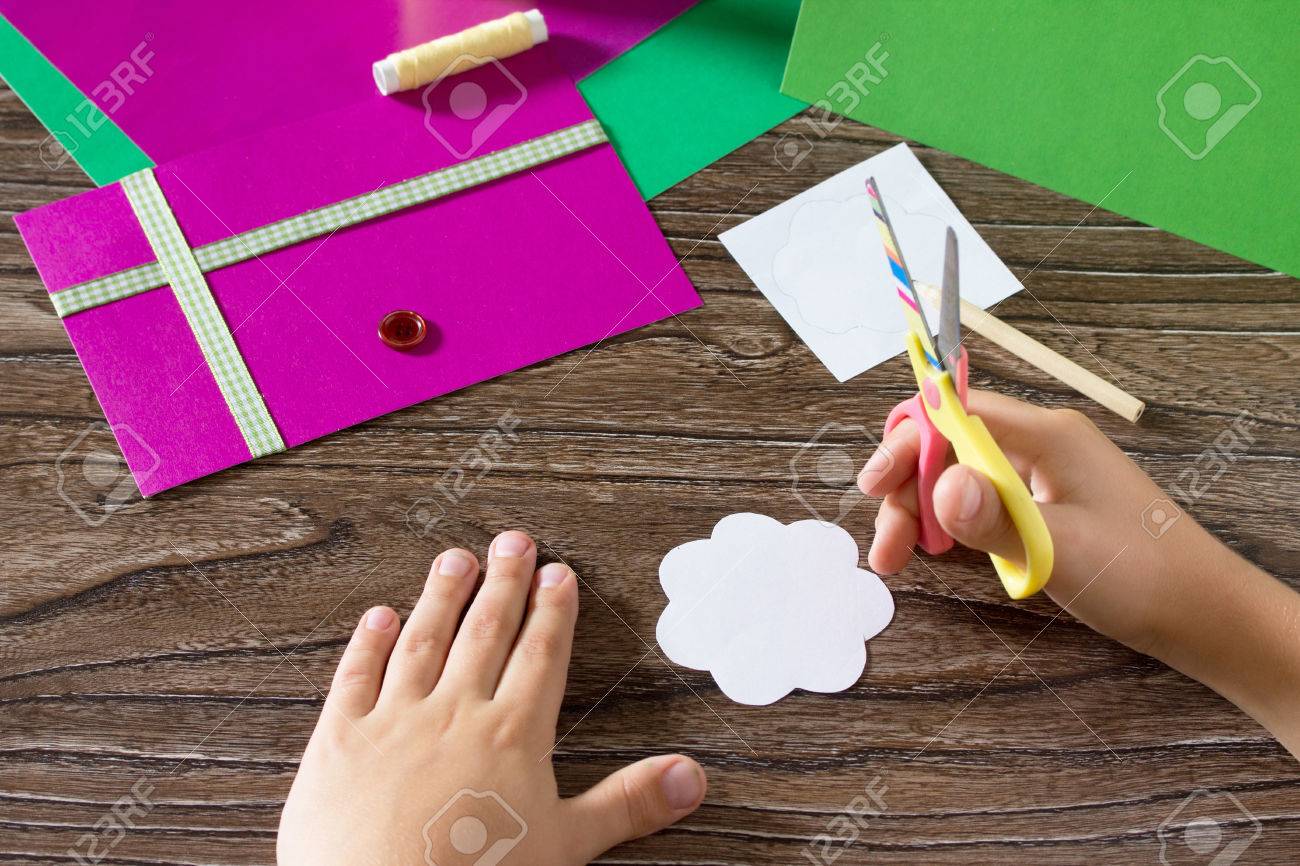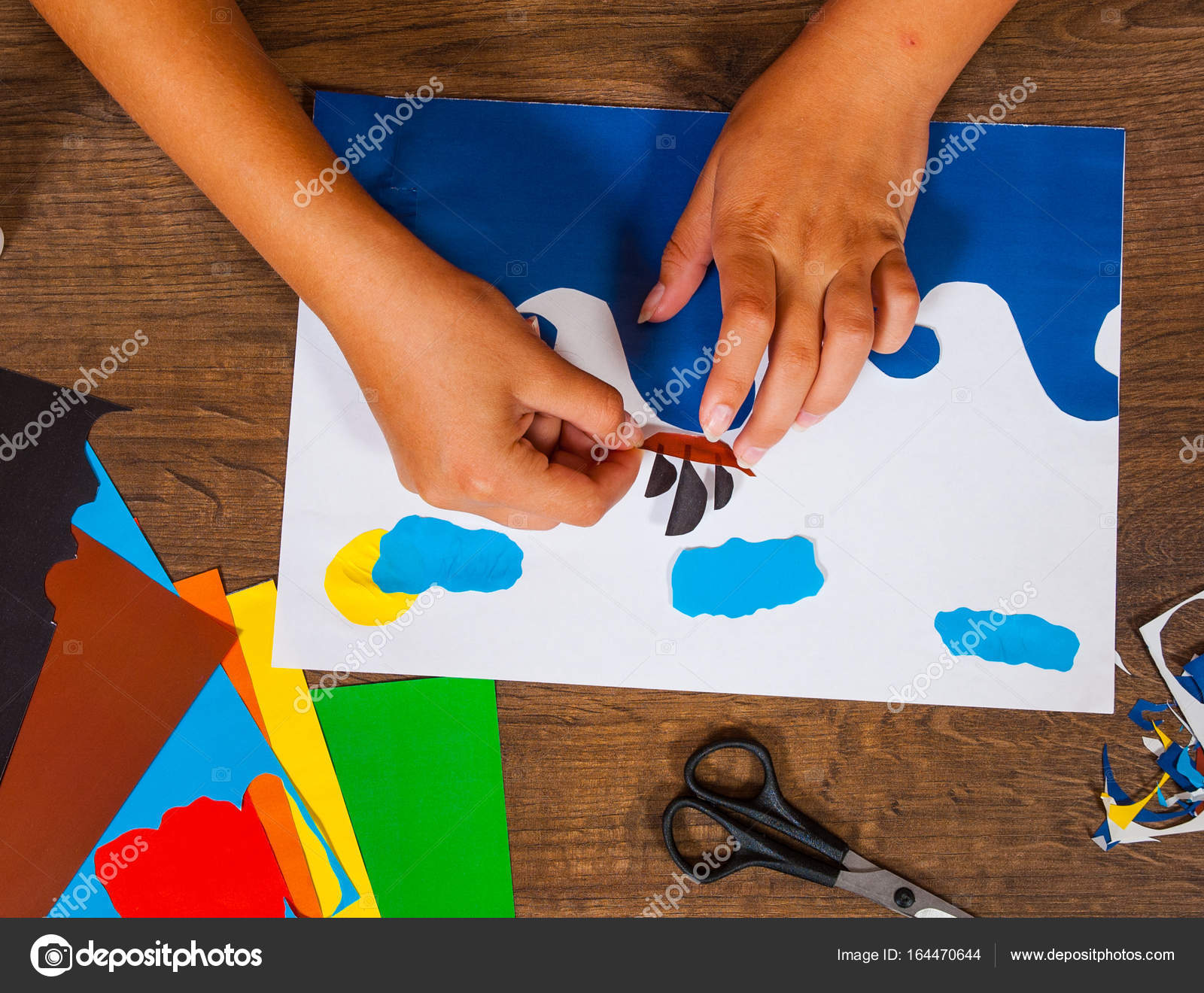 Child Glues Of Paper Sheets Of Colored Paper Kids Art Crafts